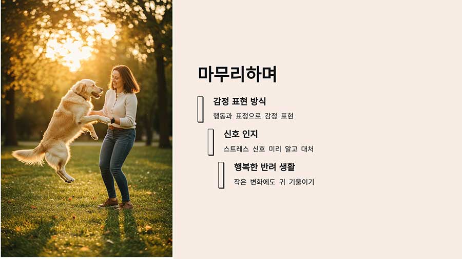 일정한 루틴을 유지하고, 규칙적인 산책과 놀이를 통해 강아지의 신체적·정신적 건강을 챙겨주세요. 긍정적인 환경을 조성하는 것도 중요합니다.