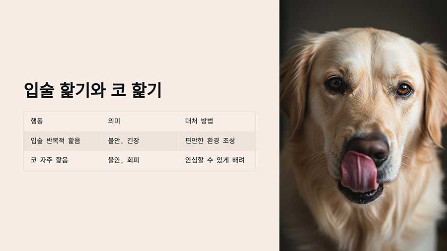 | 코를 자주 핥음 | 불안을 느끼거나 회피하려 함 | 강아지가 안심할 수 있도록 배려함 |