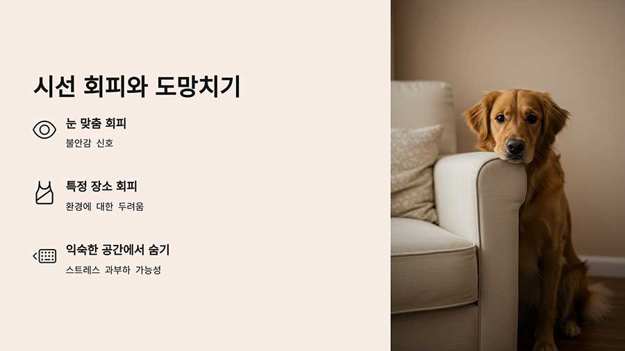 강아지가 보호자나 다른 개의 시선을 피하려 한다면, 이는 불안감을 느끼고 있다는 신호입니다. 눈을 마주치지 않거나 몸을 돌려서 도망치려는 행동은 스트레스가 쌓였을 때 자주 나타나는 반응이에요. 특히 강아지가 특정한 사람이나 환경을 피하려 한다면, 그 원인을 찾아보는 것이 중요합니다.