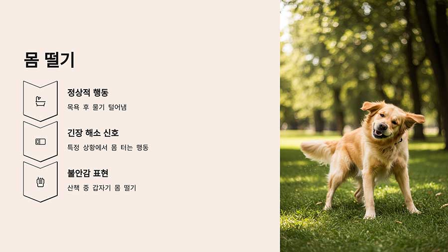 강아지는 목욕 후 물기를 털어낼 때 몸을 터는 행동을 합니다. 하지만 특별한 이유 없이 몸을 떠는 경우, 이는 스트레스를 해소하려는 행동일 가능성이 있습니다. 특히, 낯선 환경에서 몸을 터는 행동을 한다면 강아지가 긴장을 풀고 싶어한다는 신호일 수 있어요. 이러한 행동을 보일 때는 강아지가 안심할 수 있도록 조용한 환경을 조성해 주세요.