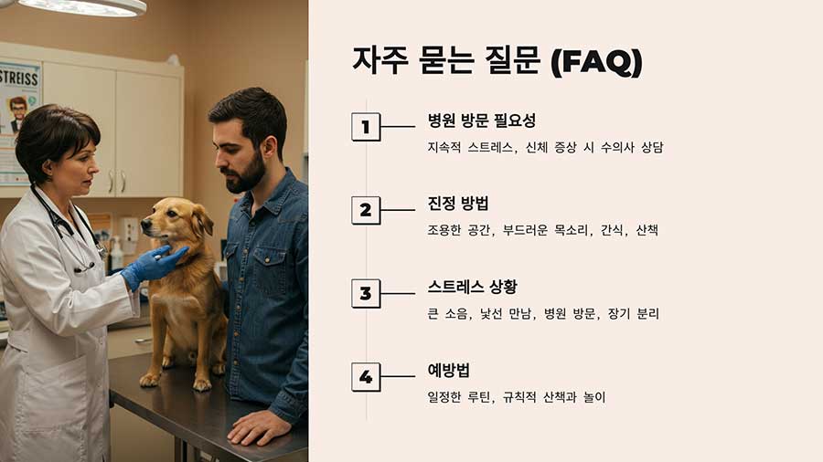 반드시 병원에 가야 하는 것은 아니지만, 스트레스가 지속되거나 신체적인 증상(식욕 감소, 설사 등)이 나타나면 수의사와 상담하는 것이 좋습니다.