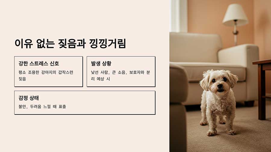 강아지가 이유 없이 계속 짖거나 낑낑거리는 경우, 이는 스트레스를 받고 있다는 강력한 신호입니다. 특히 평소 조용한 강아지가 갑자기 많이 짖는다면 불안이나 두려움을 느끼고 있을 가능성이 큽니다. 이런 행동은 낯선 사람을 만났을 때, 큰 소음이 들릴 때, 혹은 보호자와의 분리가 예상될 때 더욱 두드러집니다.