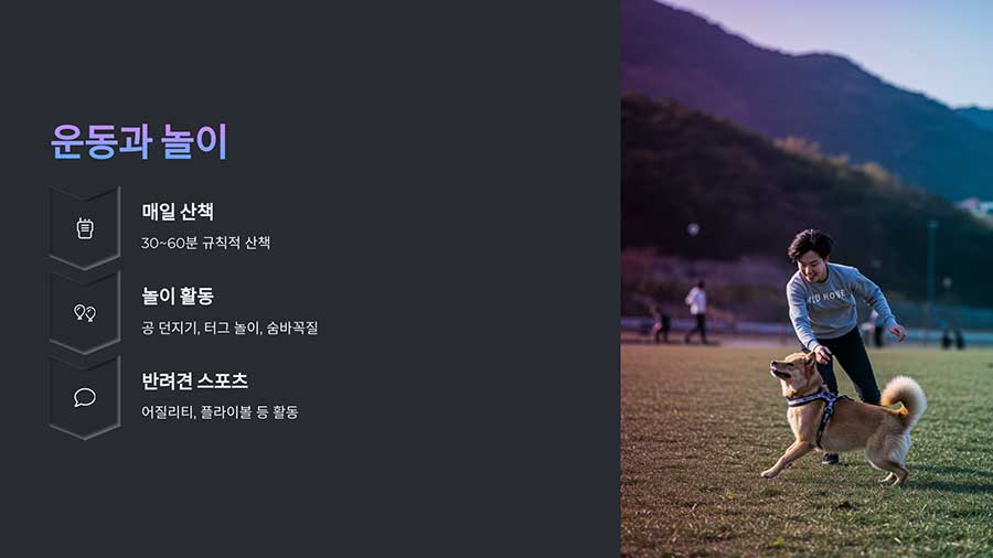 - 매일 30~60분 산책 (강아지의 크기에 따라 조절)