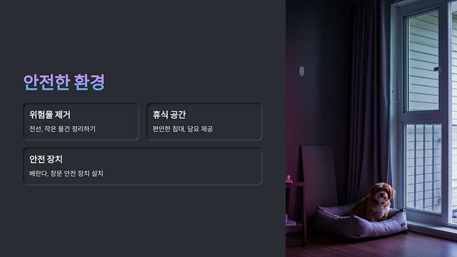 반려견이 안전하게 생활하려면 적절한 환경을 만들어줘야 해요. 집 안팎에서 발생할 수 있는 위험 요소를 제거하고, 강아지가 편안하게 지낼 수 있도록 배려해야 합니다.