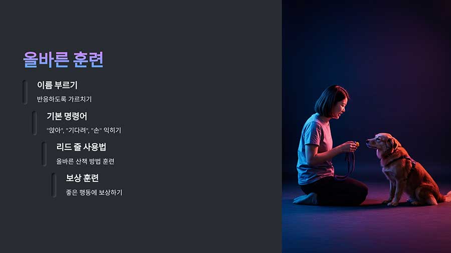 - "앉아", "기다려", "손" 같은 기본 명령어 익히기