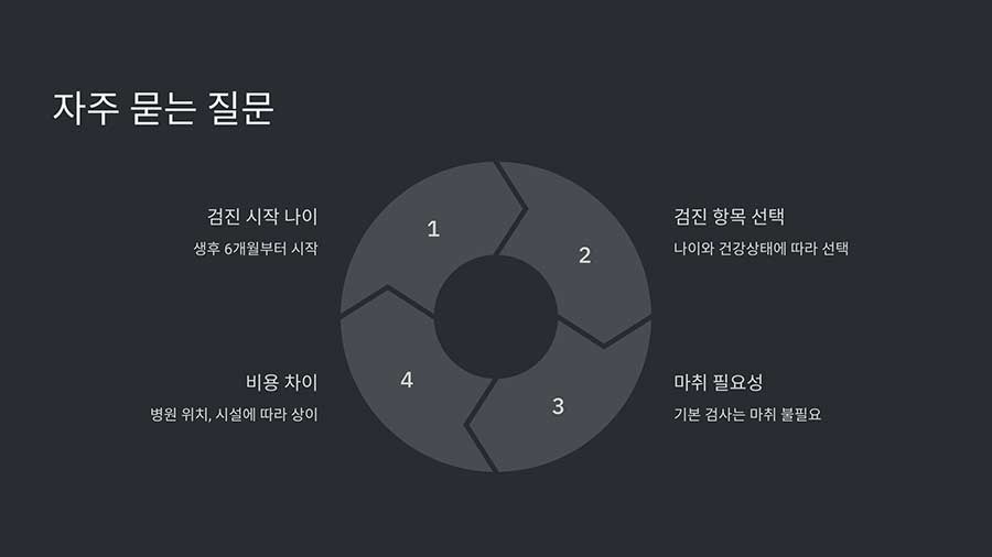 생후 6개월부터 건강 검진을 시작하는 것이 좋으며, 1세 이상부터는 정기 검진을 추천합니다.