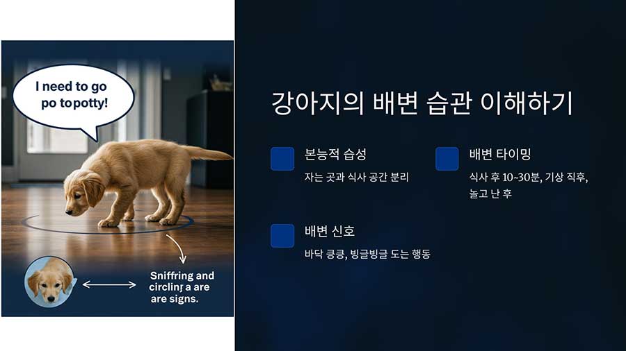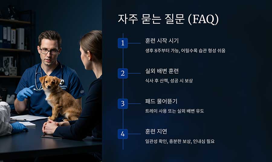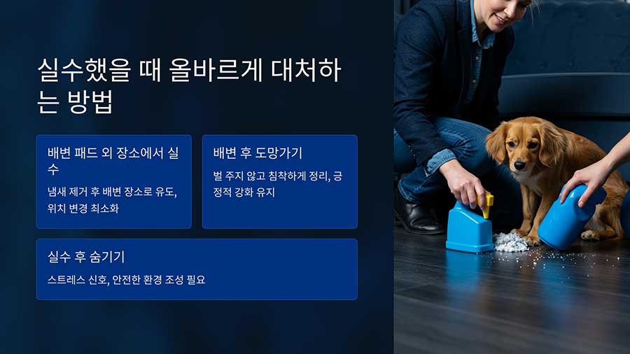 | 배변 후 도망가기 | 벌을 주지 않고 침착하게 정리, 긍정적 강화 유지 |