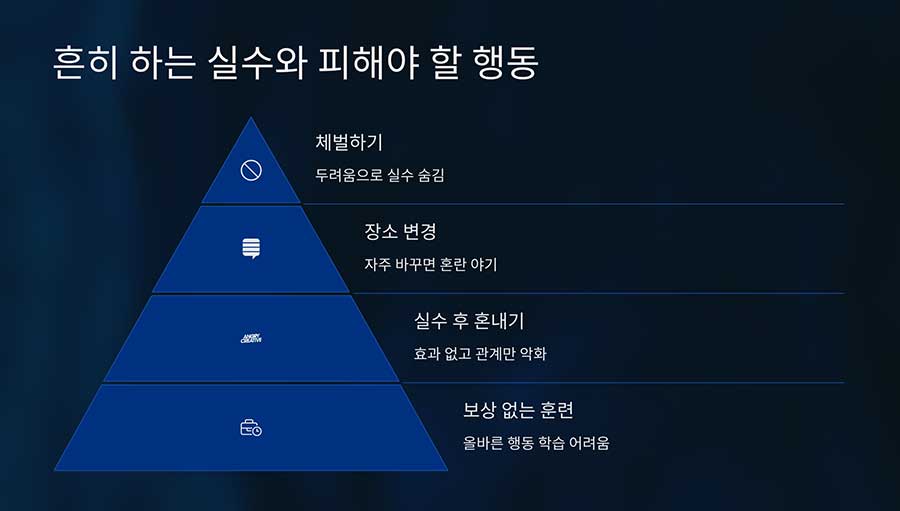 - 실수 후 강아지를 혼내기: 이미 지난 실수에 대해 혼내면 효과가 없습니다.