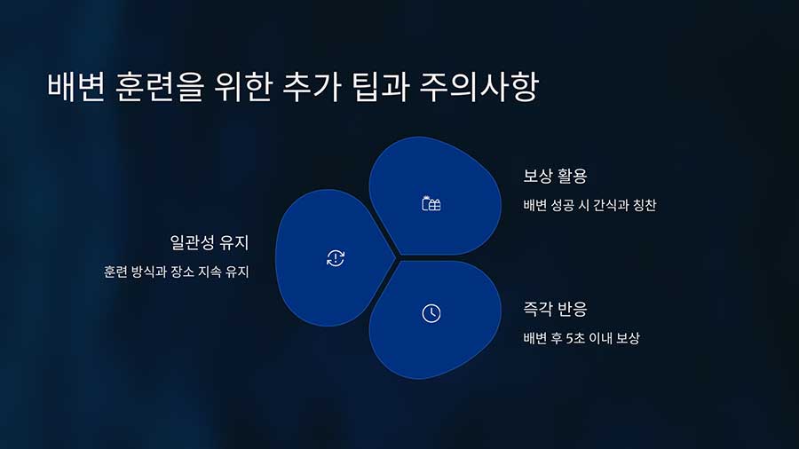 | 너무 늦은 반응 금지 | 배변 후 5초 이내에 보상을 줘야 효과적입니다. |