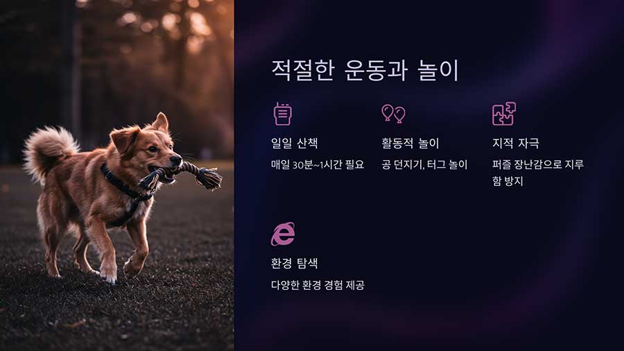 강아지는 충분한 신체 활동을 해야 건강하고 행복한 삶을 살 수 있습니다. 운동은 체력뿐만 아니라 정신적 건강에도 긍정적인 영향을 줍니다.