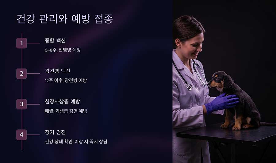 | 종합 백신 | 6~8주 | 전염병 예방 |