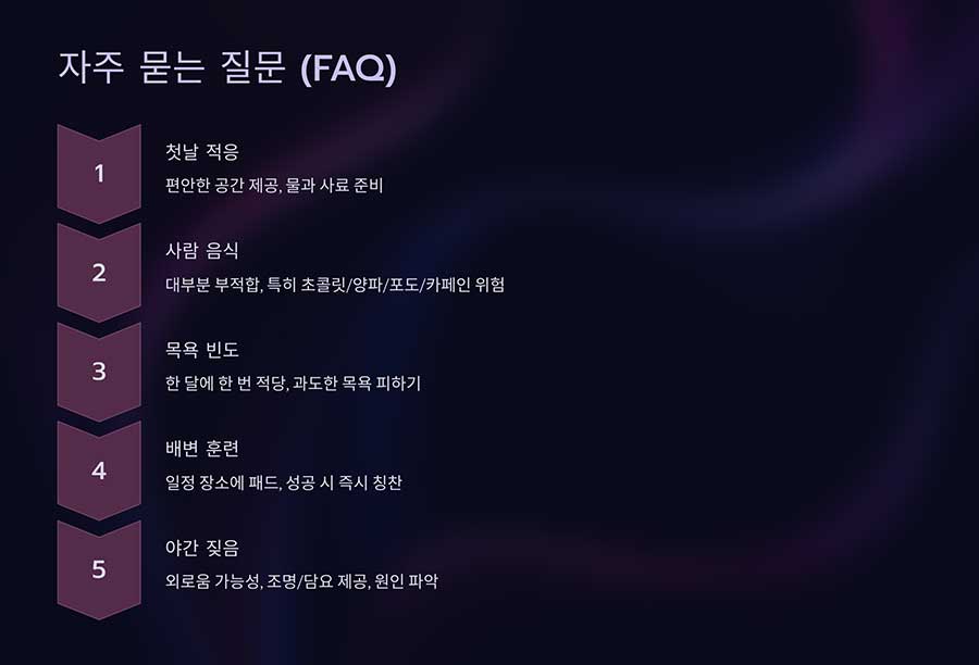 일정한 장소에 배변 패드를 놓고, 강아지가 배변을 보면 즉시 칭찬해 주세요. 실수했을 때는 야단치지 말고 조용히 청소한 후 다시 교육을 반복하세요.