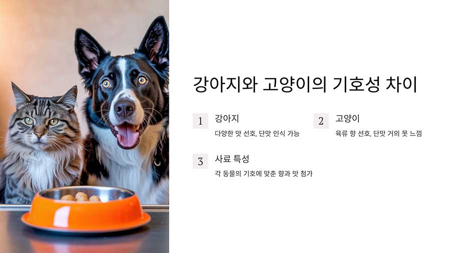 - 강아지는 다양한 맛을 선호하지만, 고양이는 특정한 육류 향을 좋아함.