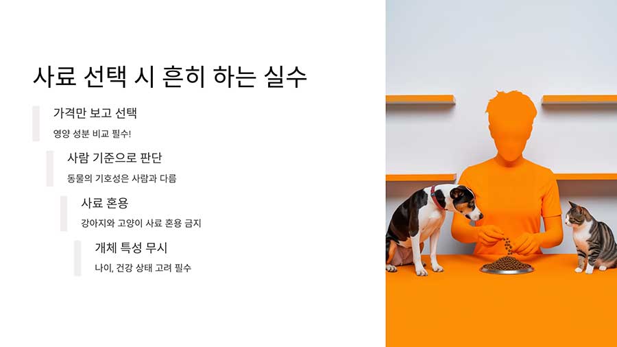 많은 반려인들이 사료 선택에서 실수를 하곤 해요. 아래의 흔한 실수를 피하면 반려동물의 건강을 더욱 지켜줄 수 있습니다.