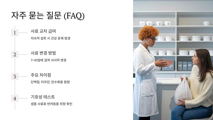 사료를 갑자기 바꾸면 소화 장애가 생길 수 있으므로, 7~10일에 걸쳐 서서히 변경하는 것이 좋아요.