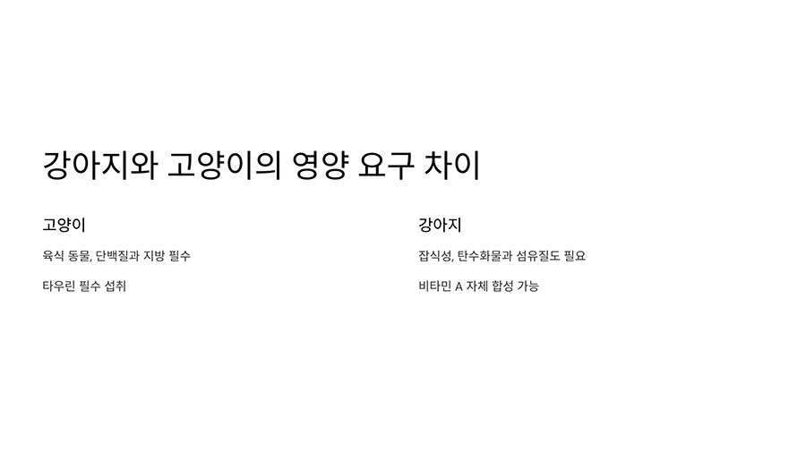강아지와 고양이는 영양학적으로 완전히 다른 요구사항을 가지고 있어요. 가장 큰 차이점은 단백질과 필수 아미노산의 필요성입니다. 고양이는 육식 동물로서 단백질과 지방이 풍부한 식단이 필수적이에요. 특히 타우린이라는 필수 아미노산을 반드시 섭취해야 하죠. 반면 강아지는 잡식성 동물로 단백질뿐만 아니라 탄수화물과 섬유질도 일정량 필요합니다.