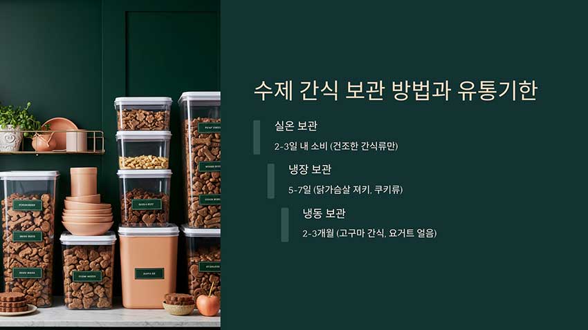 수제 간식은 방부제가 없기 때문에 올바르게 보관해야 신선하게 오래 먹일 수 있어요. 간식의 종류에 따라 적절한 보관 방법을 선택하는 것이 중요합니다.