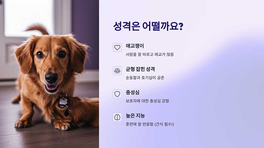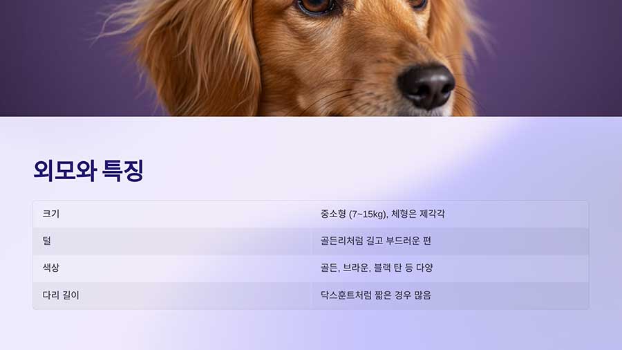 외모는 정말 ‘세상 힐링’이에요. 골든리트리버의 부드러운 털과 닥스훈트의 짧고 통통한 몸매가 합쳐져서, 귀엽고 사랑스러운 비주얼을 만들어내죠. 특히 긴 몸과 짧은 다리, 복슬복슬한 귀를 보면... 진짜 심장이 간질간질합니다.