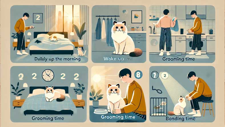 랙돌과 함께 살다 보면 자연스럽게 하루의 루틴도 바뀌게 되죠. 저는 솜이 덕분에 아침형 인간이 되었어요. 매일 아침 6시 30분이면 "야옹" 하는 작고 부드러운 알람으로 시작됩니다.