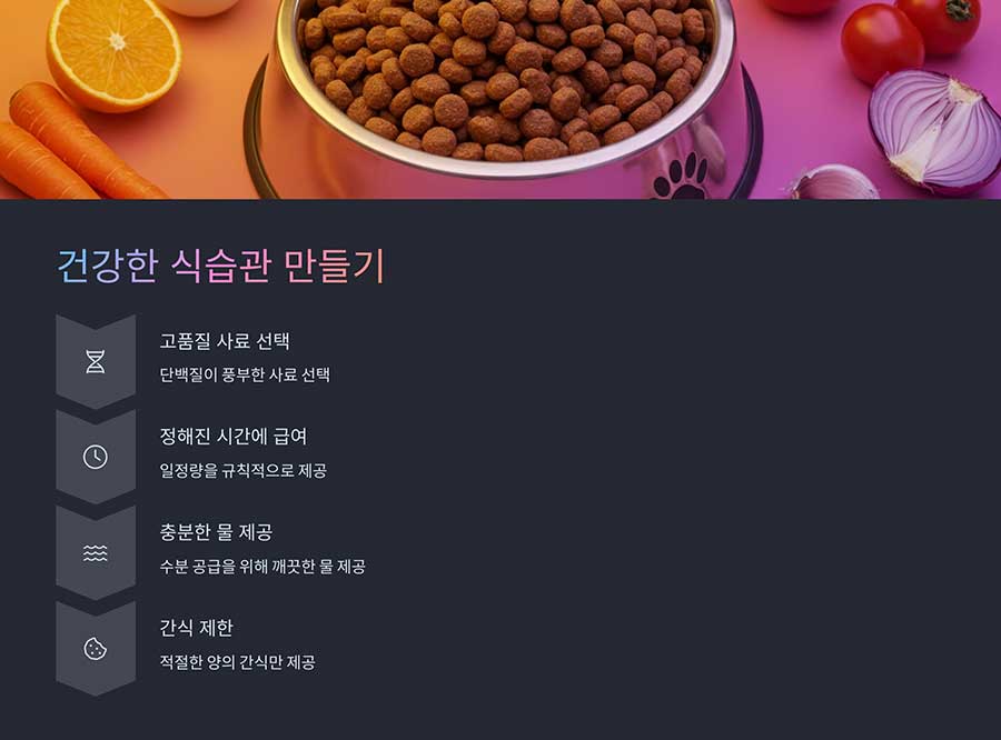 식사의 환경을 점검하고, 일정한 시간에 급여하는 습관을 들이세요. 기호성이 높은 사료로 바꾸거나, 사료 위에 약간의 저염 육수를 뿌려주는 것도 방법입니다.
