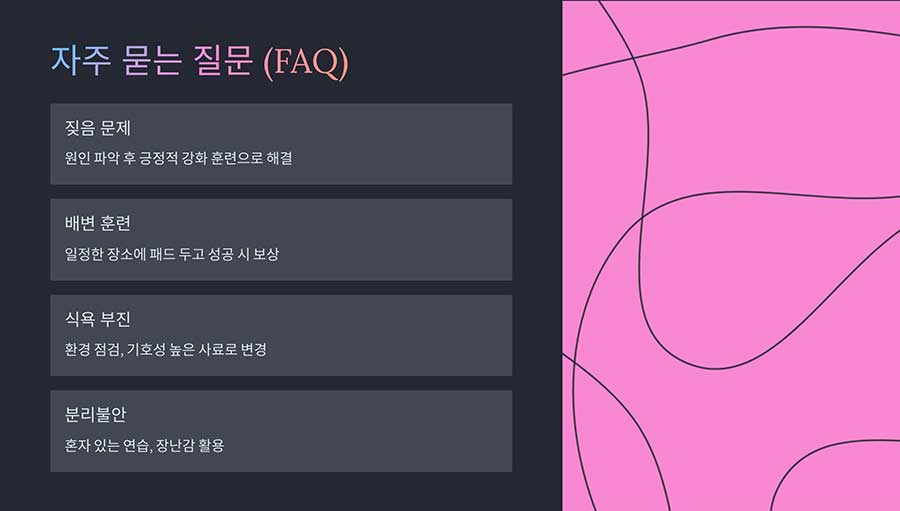 - 배변 훈련: 정해진 장소에서 배변하도록 지도해야 합니다.