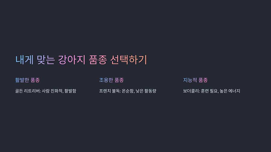 | 보더콜리 | 지능적, 훈련이 필요, 높은 에너지 | 운동을 좋아하는 보호자 |