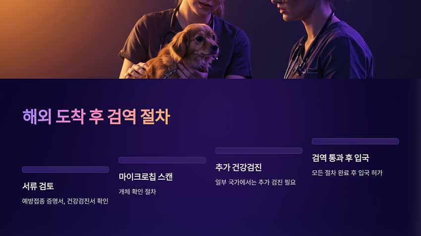 일부 국가(예: 호주, 뉴질랜드, 일본)에서는 검역 기간이 최대 몇 주까지 소요될 수 있으므로 사전에 충분한 준비가 필요합니다. 출국 전에 해당 국가의 동물 검역소 또는 대사관 웹사이트에서 최신 정보를 확인하세요.