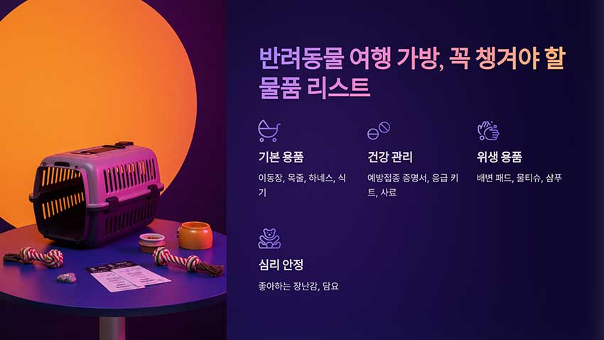 반려동물과 함께 여행을 떠날 때는 필수 용품을 빠짐없이 챙기는 것이 중요합니다. 특히 장시간 이동 시 반려동물이 편안하게 지낼 수 있도록 준비물을 잘 갖춰야 해요. 아래 체크리스트를 참고하세요!