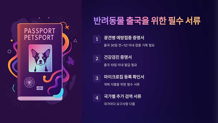 대부분의 국가에서 광견병 예방접종 증명서, 건강검진서, 마이크로칩 등록 확인서가 필수입니다. 일부 국가에서는 추가적인 검역 절차가 필요할 수도 있으므로, 사전에 해당 국가의 규정을 확인하세요.