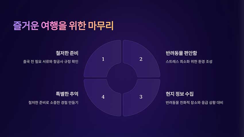 반려동물과 함께하는 해외여행, 처음에는 복잡하게 느껴질 수 있지만 철저한 준비만 한다면 소중한 추억을 만들 수 있는 멋진 경험이 될 거예요. 출국 전 필요한 서류와 항공사 규정을 꼼꼼히 확인하고, 반려동물이 편안하게 여행할 수 있도록 신경 써 주세요. 여러분도 반려동물과 함께 특별한 여행을 떠날 준비가 되셨나요? 즐거운 여행 되세요!