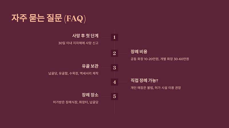 법적으로는 개인적인 매장은 불법일 수 있으며, 환경 보호를 위해 지자체에서 허가받은 장례 시설을 이용하는 것이 권장됩니다.