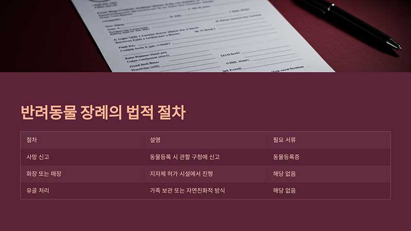 반려동물이 세상을 떠나면, 법적으로 처리해야 할 절차가 있습니다. 특히 동물등록이 되어 있는 경우, 사망 신고를 해야 하며 폐기물 처리법에 따라 장례 방법도 정해져 있습니다. 아래 표를 참고하여 각 절차를 확인해 보세요.