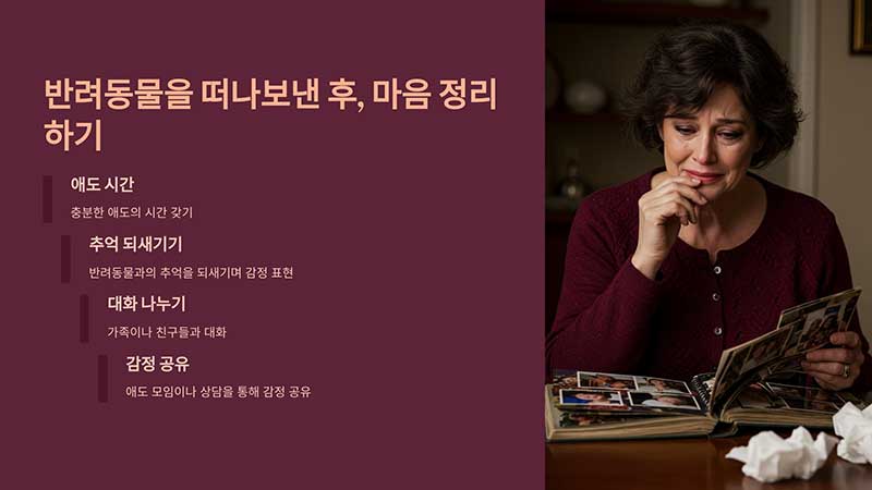 반려동물과의 소중한 기억을 간직하며 충분한 애도 시간을 가지는 것이 중요합니다. 가족, 친구들과 감정을 나누거나, 애도 모임 또는 전문가 상담을 받아보는 것도 도움이 됩니다.