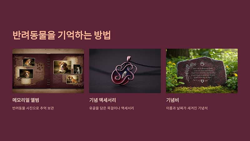 - 납골당: 반려동물 전용 봉안당에서 유골을 보관합니다.