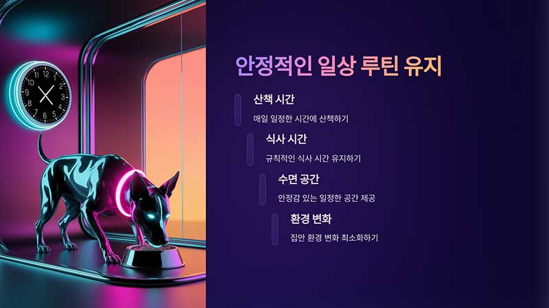 특히 새로운 가족 구성원이 생기거나, 이사를 하는 등의 변화가 있을 때는 반려동물이 적응할 시간을 충분히 가질 수 있도록 배려해야 합니다. 안정적인 루틴을 유지하면 반려동물의 불안감이 줄어들고, 더 행복하고 건강한 생활을 할 수 있습니다.