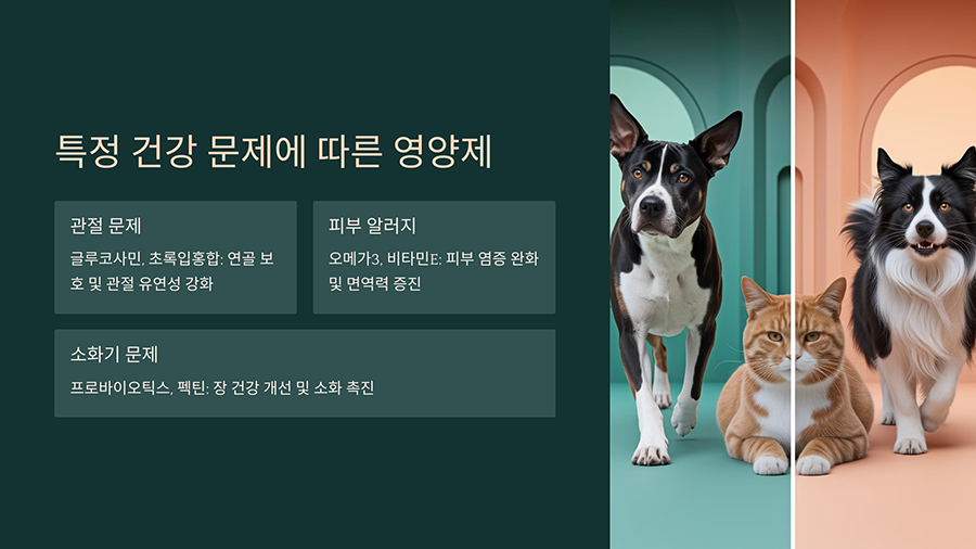 반려동물이 특정 건강 문제를 가지고 있다면, 맞춤형 영양제를 고려해야 합니다. 일반적인 건강 문제와 추천되는 영양제를 정리해 보았습니다.