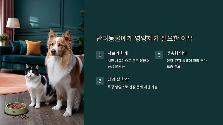 반려동물의 건강은 올바른 식습관에서 시작됩니다. 그러나 시판 사료만으로 모든 영양소를 충분히 공급할 수 있을까요? 사실 그렇지 않습니다. 일부 사료는 특정 영양소가 부족하거나, 반려동물의 연령, 건강 상태에 따라 추가적인 보충이 필요할 수 있어요. 특히 성장기 강아지나 노령견, 또는 특정 질환을 가진 반려동물에게는 맞춤형 영양 보충이 필수적이죠.