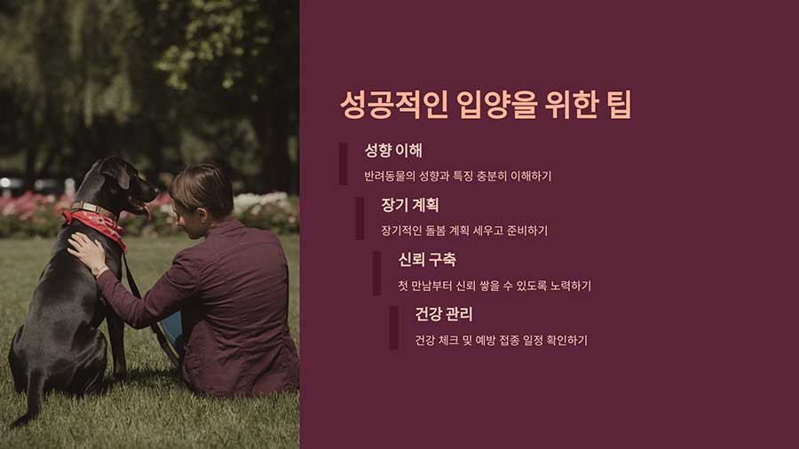 반려동물 입양은 단순한 선택이 아니라 오랜 책임이 따르는 결정입니다. 성공적인 입양을 위해 다음과 같은 팁을 기억하세요.