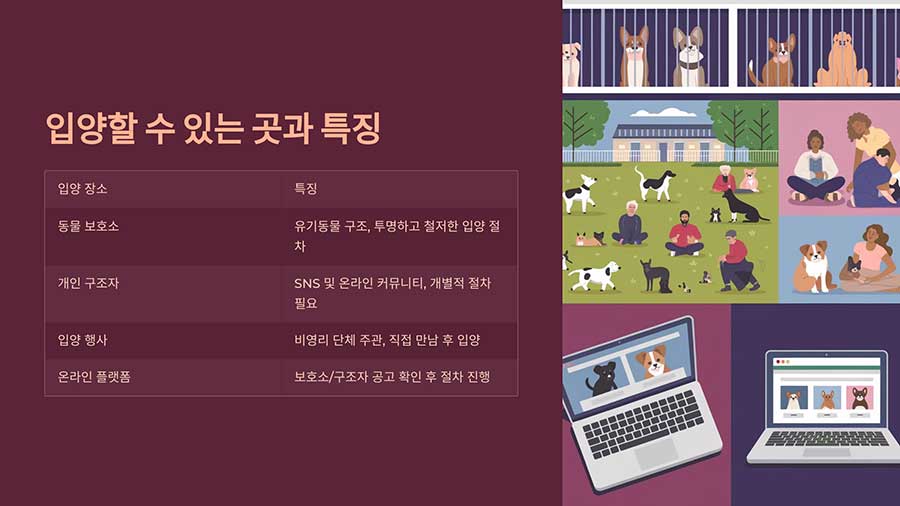 | 개인 구조자 | SNS 및 온라인 커뮤니티에서 입양 가능, 개별적인 절차가 필요할 수 있음 |