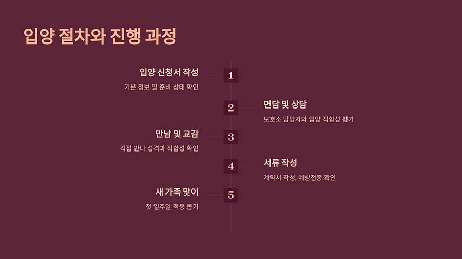 | 1. 입양 신청서 작성 | 기본 정보 및 반려동물을 키울 준비가 되어 있는지 확인하는 과정 |