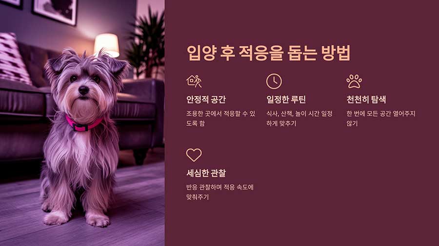 새로운 환경에 적응하는 것은 반려동물뿐만 아니라 보호자에게도 중요한 과정입니다. 입양 초기의 적응을 돕기 위해 다음과 같은 방법을 활용해 보세요.