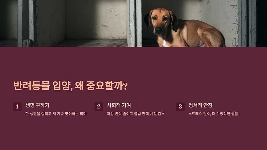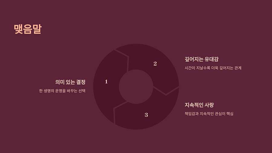 반려동물 입양은 단순한 선택이 아니라 한 생명의 운명을 바꾸는 의미 있는 결정입니다. 처음에는 걱정도 많고 어려운 순간도 있을 수 있지만, 시간이 지날수록 반려동물과의 유대감은 더욱 깊어질 거예요. 책임감을 가지고 신중하게 결정하는 것이 중요하며, 입양 후에도 지속적인 관심과 사랑을 주는 것이 가장 큰 핵심입니다.