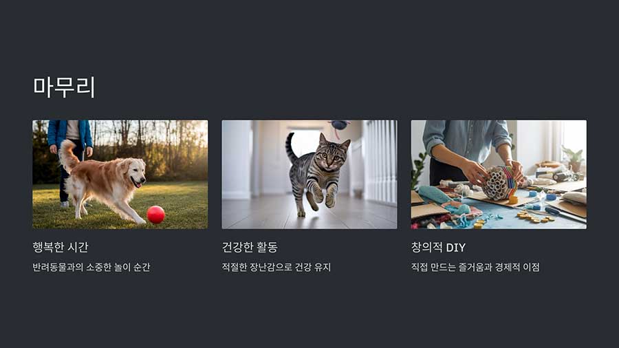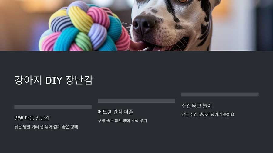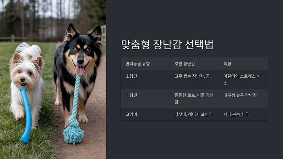 | 강아지 (대형견) | 튼튼한 로프, 퍼즐 장난감 | 강한 씹는 습관을 고려한 내구성 장난감 |