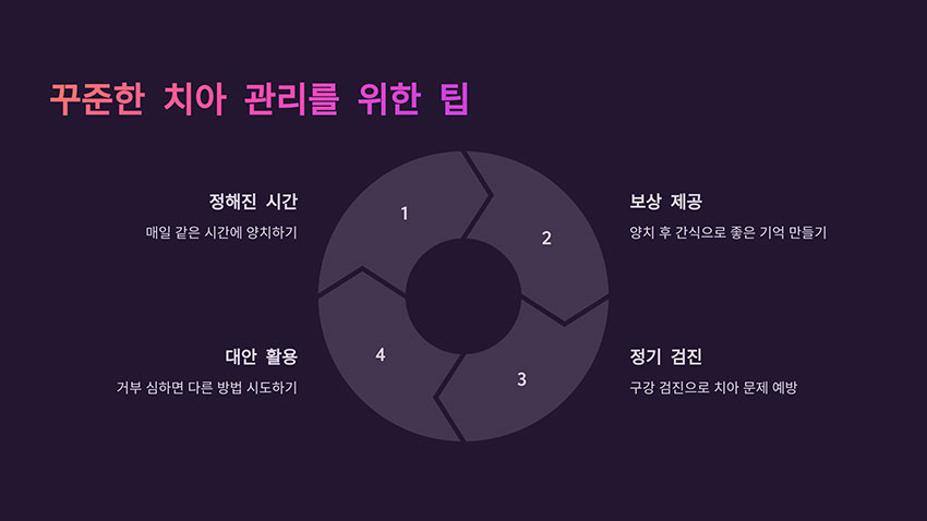 치아 관리는 단기간에 끝나는 것이 아니라 평생 동안 지속해야 하는 일입니다. 반려동물이 스트레스 없이 꾸준히 양치 습관을 들일 수 있도록, 다음과 같은 방법을 실천해 보세요.
