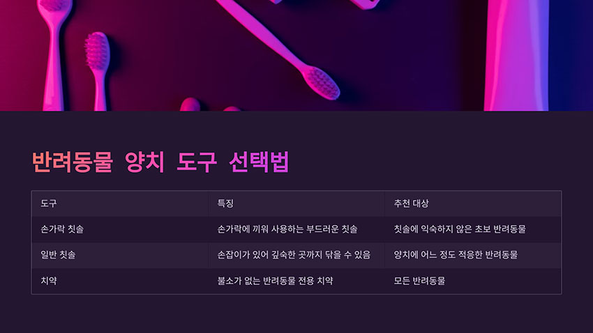 | 손가락 칫솔 | 손가락에 끼워 사용하는 부드러운 칫솔 | 칫솔에 익숙하지 않은 초보 반려동물 |