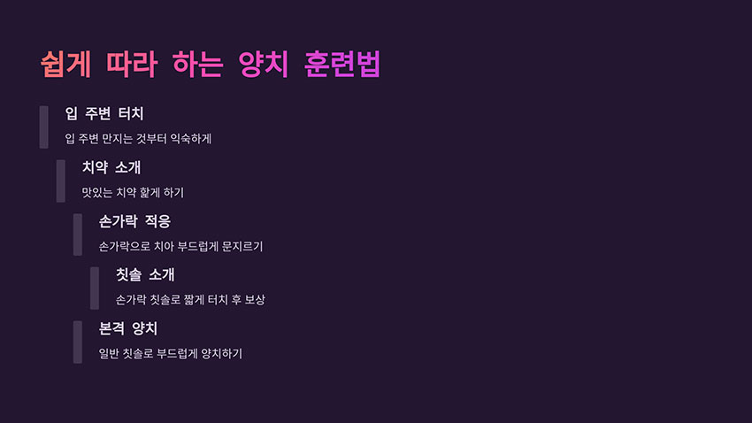처음부터 칫솔을 들이대면 반려동물은 당황할 수 있어요. 천천히 단계를 밟아가며 긍정적인 경험을 쌓아보세요. 다음은 단계별로 진행하는 양치 훈련법입니다.