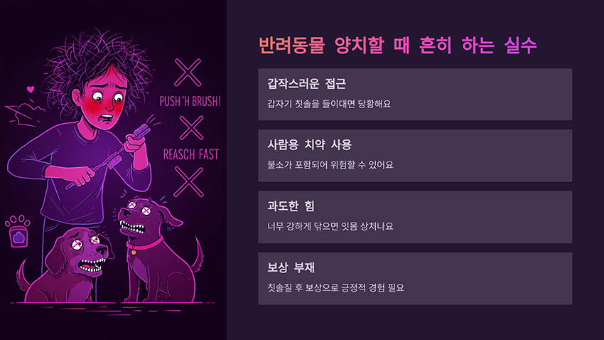반려동물 양치가 어렵게 느껴지는 이유는 보호자들이 종종 실수를 하기 때문입니다. 다음과 같은 실수는 양치 시간을 힘들게 만들 수 있으니 피하도록 해요!