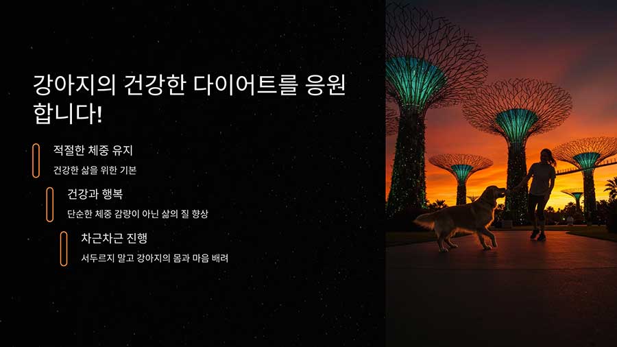 다이어트는 서서히 진행하는 것이 중요합니다. 강아지가 스트레스를 받지 않도록 점진적으로 변화를 주는 것이 핵심이에요!