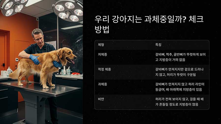 | 과체중 | 갈비뼈가 만져지지 않고 허리 라인이 둥글며, 배 아래쪽에 지방층이 있음 |