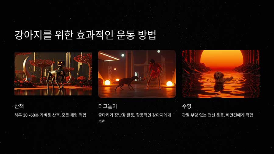 | 수영 | 관절에 부담 없이 전신 운동 가능 | 비만 강아지, 관절이 약한 강아지 |